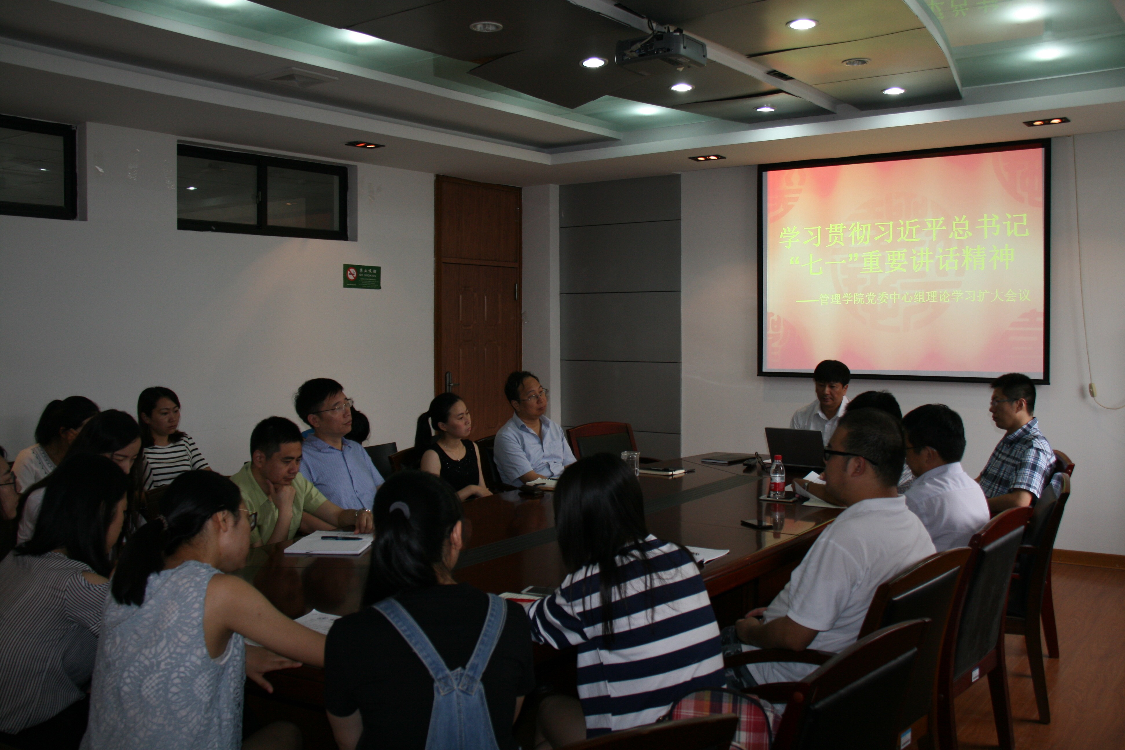 根据学校《关于认真组织学习贯彻习近平总书记在庆祝中国共产党成立95周年大会上的讲话》通知精神,管理学院于7月11日上午在9教402会议室组织召开了学习会,学习习近平总书记“七一”讲话原文并进行讨论。参加会议的有学院党政班子成员、教工和学生党支部书记共计20余人。会议由学院党委书记陈新主持。