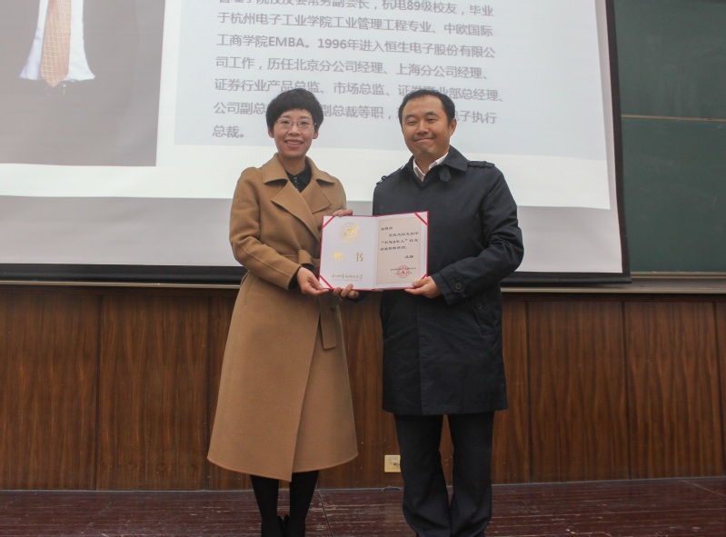 2017年12月13日下午两点整,杭州电子科技大学校友大讲堂之“金融科技赋能价值创造,持续学习丰富趣味人生”主题讲座在11教106教室如期举行。本次讲座由杭州电子科技大学合作发展处、学生处、管理学院联合举办;管理学院兼职教授、管理学院校友会常务副会长、我校89级校友、恒生电子执行总裁官晓岚先生主讲。校合作发展处处长张钟蕾老师、管理学院党委书记陈新老师、招生就业处副处长周星星老师、管理学院党委副书记陈新峰老师以及来自管理学院、经济学院的老师同学们参加该讲座。