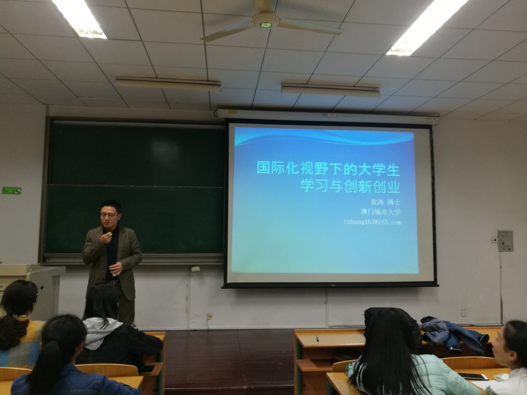 10月16日-17日两天,管理学院工商管理系邀请中国澳门城市大学旅游与管理学院博士生导师张涛博士面向大一新生举办《国际化视野下的大学生学习与创新创业》讲座以及面向青年教师举办《国际化视野下的教学组织与教学方法》座谈。