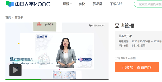 《品牌管理》课程采用翻转课堂的教学模式,是2019年浙江省线上线下混合式一流课程,浙江省本科高校2020“互联网+教学”优秀案例一等奖课程。课程团队在中国大学MOOC平台建设了MOOC和SPOC,学生除了要完成课程实践任务,还需要完成线上学习任务。