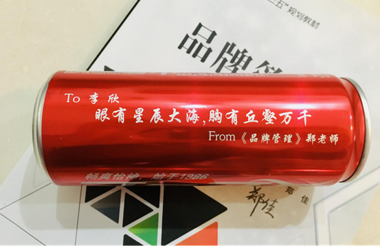 紧张而忙碌的课程学习结束了,但是同学们未来还有更长的路要走,《品牌管理》教师团队将对学生的鼓励与期待印在了可乐罐上,愿同学们: