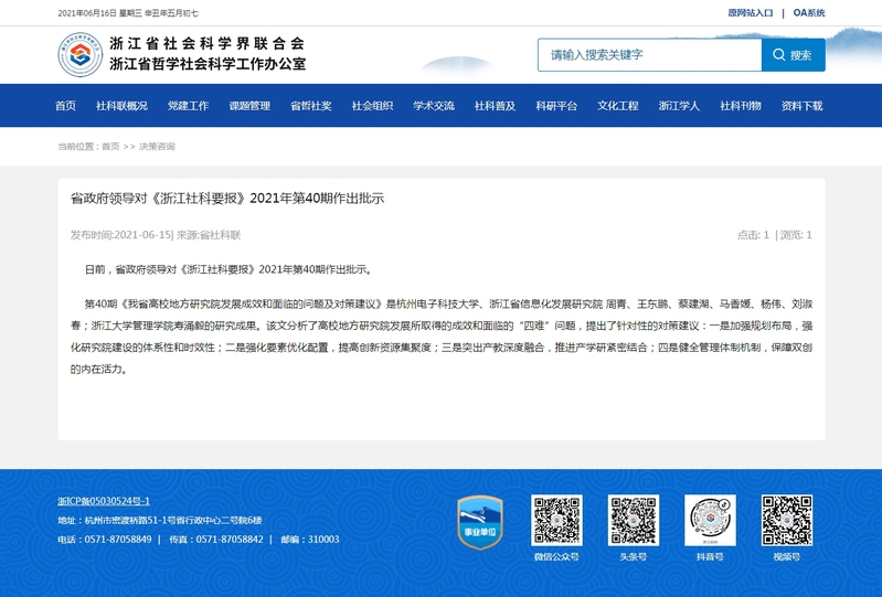 日前,省政府领导对《浙江社科要报》2021年第40期作出批示。