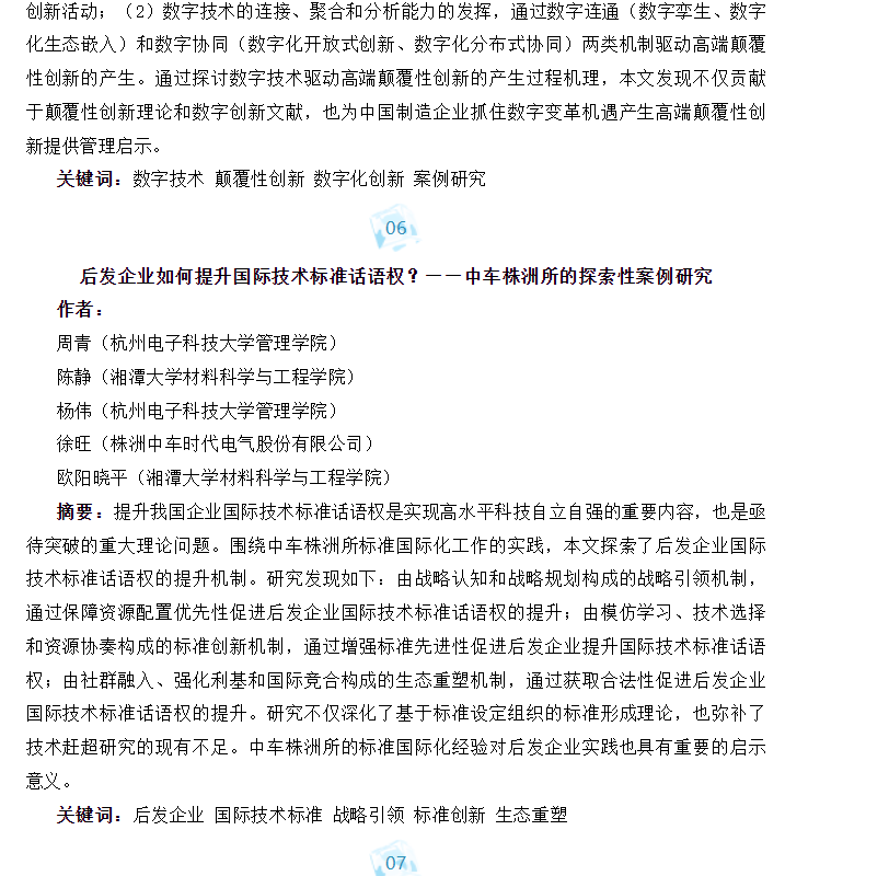近日,我院周青教授为第一作者、杨伟教授为通讯作者的论文《后发企业如何提升国际技术标准话语权?——中车株洲所的探索性案例研究》在2023年第七期《管理世界》发表。