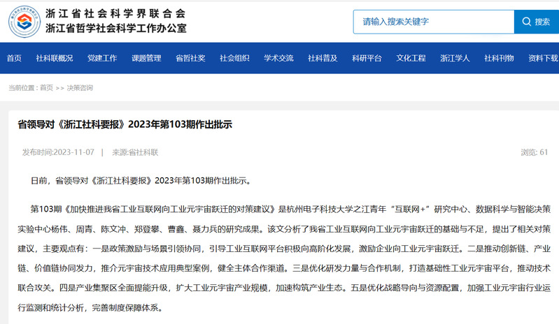 日前,省领导对《浙江社科要报》2023年第103期作出批示。