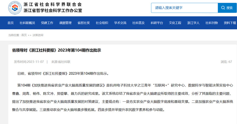 日前,省领导对《浙江社科要报》2023年第104期作出批示。