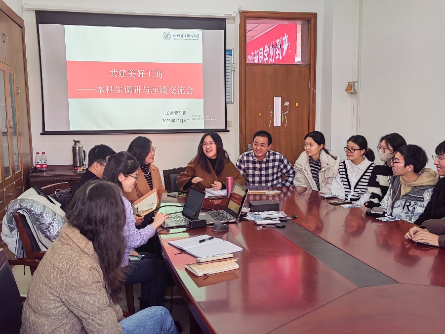 12月6日下午,管理学院工商管理系在9教428召开本科生调研与座谈交流会。交流会由工商管理系主任张慧教授主持,工商管理系骨干教师郑佳副教授,禹献云副教授以及四位新生班主任和十三位学生代表一同参加。