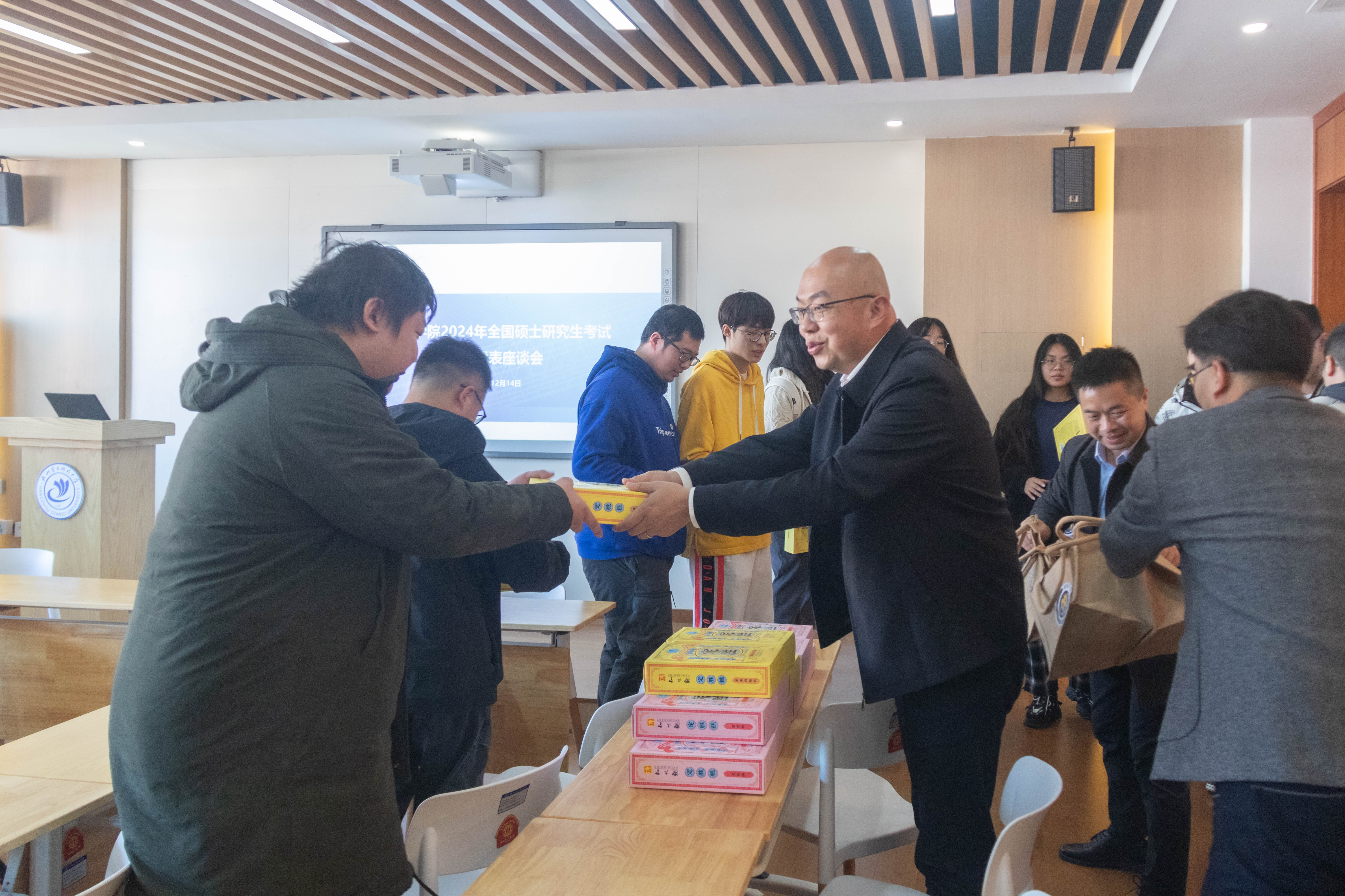 学院领导与考研学生亲切交流,询问考生复习进度、生活保障等情况。杨伟院长勉励同学们,考研不仅仅是一个人的战斗,还有来自学校、家长和社会各界的关心和支持;胡保亮副院长结合自身的考研经历,叮嘱同学们在备考的最后阶段,既要按照计划持之以恒地学习,也要保持良好的心态;李国冰书记提醒同学们在紧张的备考之余,要劳逸结合,保重身体,通过适当的运动调整自身状态,做到“每临大事有静气”。活动最后,三位学院领导将“考研大礼包”发放到考生手中,预祝他们一战成“硕”,顺利“上岸”。