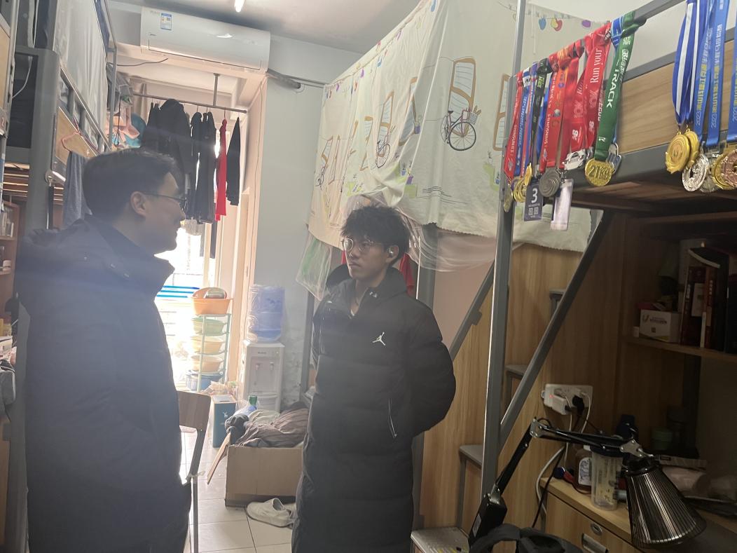 学院副院长、党委组织委员胡保亮走访联系结对寝室12北 212、11南417,他询问了同学们的期末复习情况,对学生认为难的科目做了指导,他鼓励学生要善于运用导师资源,主动与导师建立联系,在学习、生活、升学等方面有困惑的地方都可以主动寻求帮助。他鼓励2022级章侣楠同学把体育特长和管理学科相结合,叮嘱学生日常训练注意身体安全、避免受伤,学习、体育两手抓。
