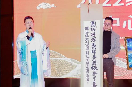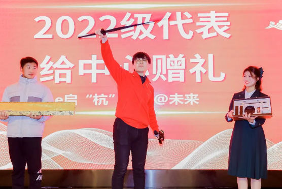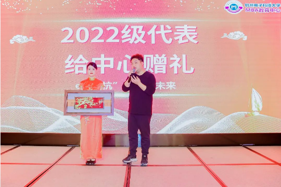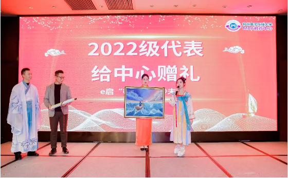 合影留念和茶歇过后,年会进入下半场。即将毕业离校的22级各班的同学,在年会上为母校准备了精美的纪念礼物。典礼上,22级MBA班同学们准备了一副金箔桃李满天下摆件,由班长刘烨同学做代表赠送给中心;22级dMBA的同学们,用情用心自创了一副书法作品和一副油画,并做了精心装裱,由班长汤国淼和陈慧同学一起作为代表赠送给中心;22级MEM班同学为中心准备了一把龙泉宝剑和文房四宝,由班长李红俊同学代为捐赠,并预祝各位老师、同学、校友龙年大吉。