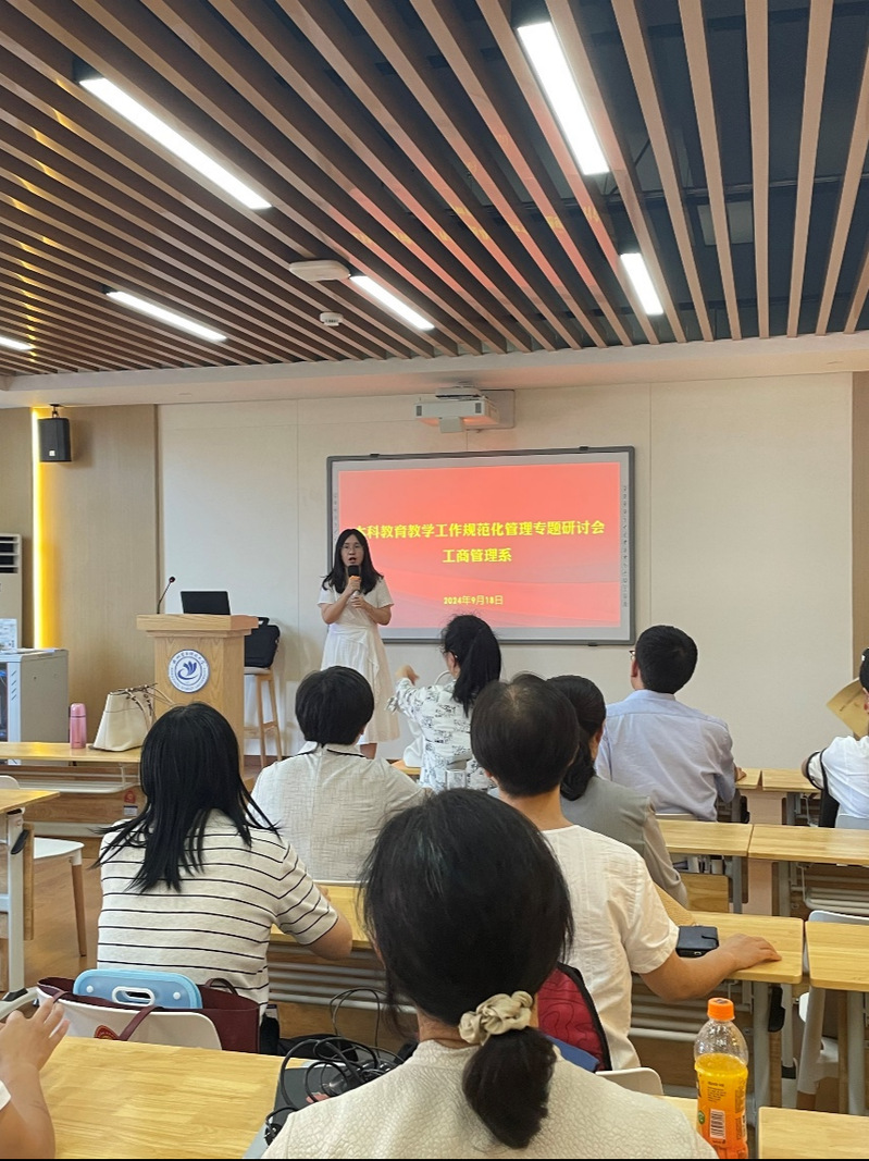9月18日下午,工商管理系于9教530召开了本科教育教学工作规范化管理专题研讨会。工商管理系30余名教师参加了本次研讨会。会议由工商管理系主任张慧老师主持。