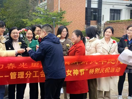 今年的女神节特别庆祝活动,我们新增了活动预热环节,即在学院楼下组织了庆祝活动的启动仪式。在启动仪式上,管理学院李国冰书记代表学院慰问和关怀了学院女教职工,并为大家送上了节日祝福和鲜花;大家喜气洋洋地和书记交流;最后合影留念。启动仪式后,女教职工们出发前往金沙湖畔,参加属于自己的特别庆祝活动。整场活动环境温馨舒适,充满了欢声笑语,获得了大家的好评与肯定。
