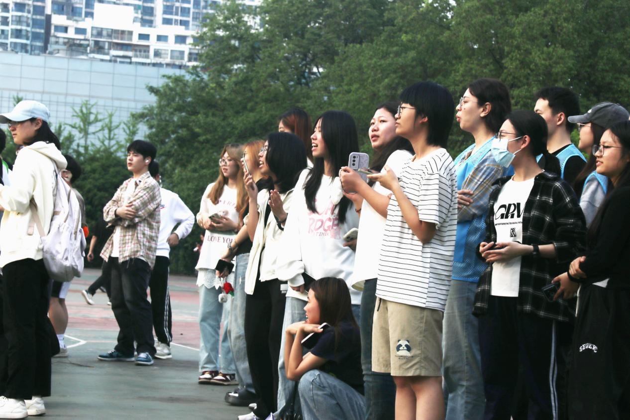 赛场边,师生观众们聚精会神观看比赛,炽烈的呐喊声中包含着青春的热血,即便在场下也绽放了属于自己的风采。