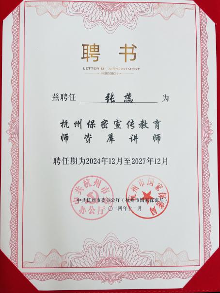 此次活动既有利于我院保密管理专业承担社会责任、辐射专业的社会影响力,也有力推动了专业与社会需求的结合。据悉,张蕊老师还获聘首批“杭州市国家保密局保密宣传教育师资库讲师”,为杭州市西湖区、上城区、余杭区,以及贵州省、云南省、河南省等省区的保密岗位工作人员,以及浙能集团等大型企业开展保密工作管理、保密法等相关培训讲座30余场,覆盖人群超千人。